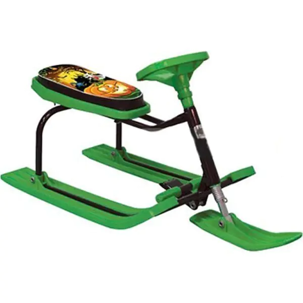 Широкие лыжи обеспечивают хорошую устойчивость на дороге, а пружинный амортизатор не позволяет детям и взрослым ощутить все кочки на своем пути. Для быстрого и безопасного торможения используется ножной тормоз.