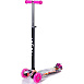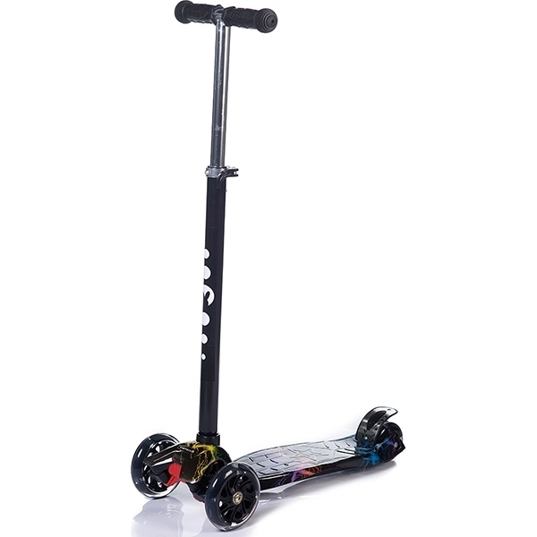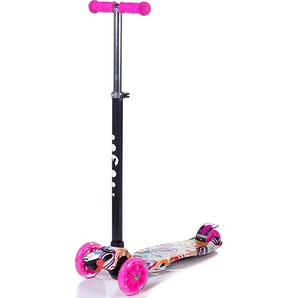 Передняя пара колес обеспечивает устойчивость на дороге. А заднее сдвоенное колесо оснащено тормозом. Яркая усиленная дека выдерживает нагрузку до 50 кг. Руль этого самоката регулируется и подстраивается под рост юного гонщика.