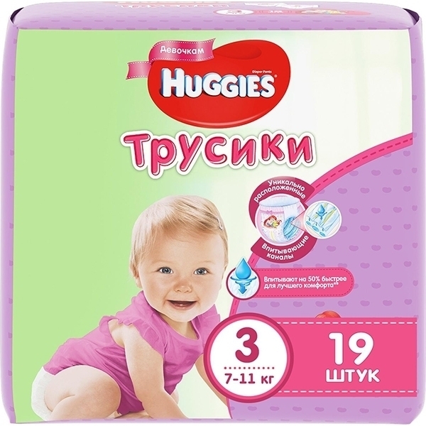 Трусики-подгузники для девочек Huggies произведены с учетом анатомических особенностей: они оснащены по центру особыми впитывающими каналами, уменьшающими набухание материалов. Внутренний слой DryTouch моментально поглощает жидкость и надежно удерживает ее внутри. Снаружи поверхность имеет видимые микропоры, пропускающие воздух внутрь. Эластичный поясок и широкие боковушки свободно тянутся в стороны, позволяя без усилий надевать и снимать трусики с ребенка.