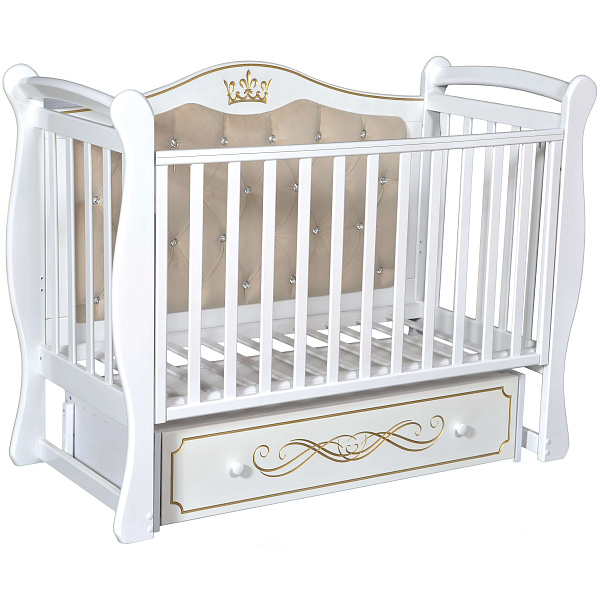 Производитель «Антел» предлагает красивый и изящный предмет мебели для детей 0-4 лет. Кроватка изготовлена из натуральной березы, а ее задняя спинка обшита нежной велюровой тканью, украшена декором в виде короны и дополнена стразами. Кроватка оборудована маятниковым механизмом универсального типа. Его можно установить вдоль и поперек кроватки. Также его можно зафиксировать, чтобы кроватка не качалась, или вовсе убрать, оставив ей классические ножки.